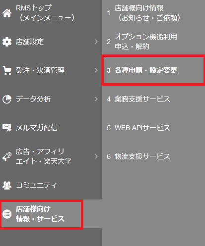 3. RMSの「店舗様向け情報・サービス」→「3.各種申請・設定変更」をクリック