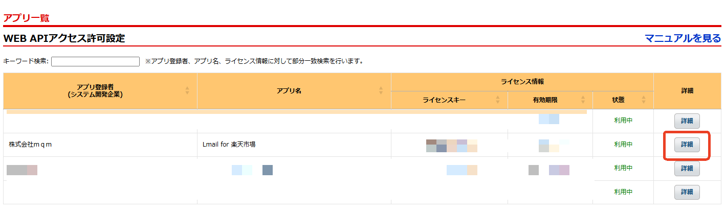 5. アプリ名「Lmail for 楽天市場」の「詳細」をクリックします。。