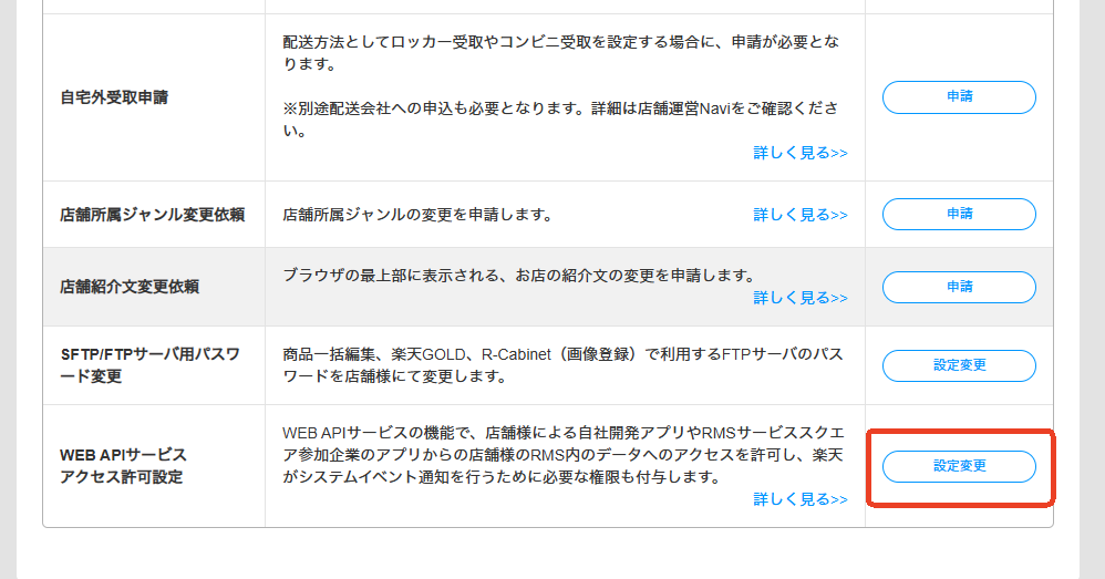 4.「WEB APIサービスアクセス許可設定」の「設定変更」をクリック